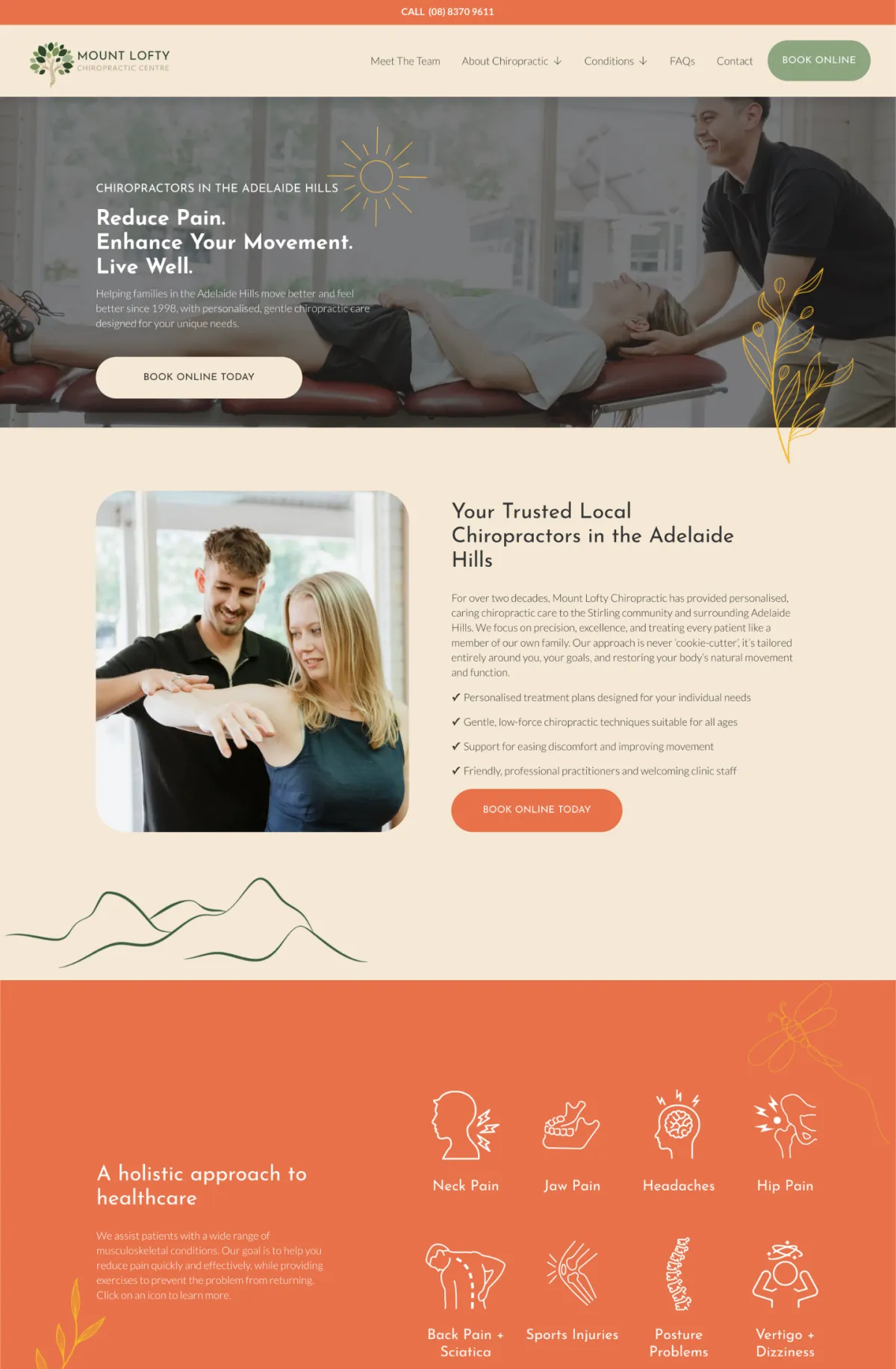 15+ page chiropractic website including home page, about us, about chiropractic, online booking, FAQ's, contact, 6 condition pages for SEO, practitioner/s pages, services pages, location pages, privacy policy